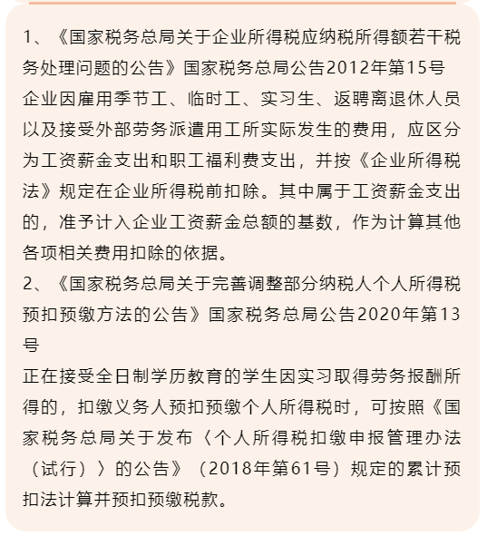 三、税收政策对于实习生的报酬如何规定?目前能够看到的有两个税收政策涉及到实习生: 这两个文件连起来看好像有点糊涂,第一个文件说的是工资薪金,第二个文件说的是劳务报酬,究竟哪个是对的?其实从上面的分析能够看到,实习生的情况较为复杂,既可能是工资薪金,也可能是劳务报酬,那么正确的理解当然是:工资薪金按第一个文件,劳务报酬按第二个文件。其实第二个文件很有趣,如果是劳务报酬本来应该按照20%—40%预扣率预扣个税,但这样扣税对实习生来说明显负担偏重,文件中对于实习生认定为劳务报酬的支出允许按照工资薪金的累计预扣法计算并预扣,实际上是对于实习生的一种特殊照顾。毕竟,对于大多数实习生来讲,可能按照劳务报酬方法就要预交个税,按照工资薪金方法预扣就不需要预交个税,区别还是很大的。